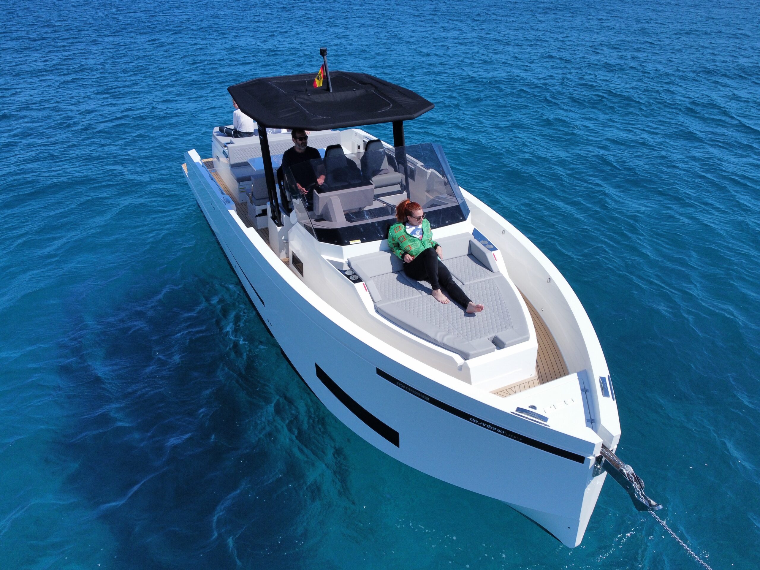 Su diseño walkaround sin cabina exterior tradicional maximiza el espacio, ofreciendo amplias zonas de solárium en proa y popa, perfectas para tomar el sol o disfrutar de un aperitivo en el mar. Además, su motorización fuera borda aporta velocidad, eficiencia y una experiencia de conducción muy deportiva.